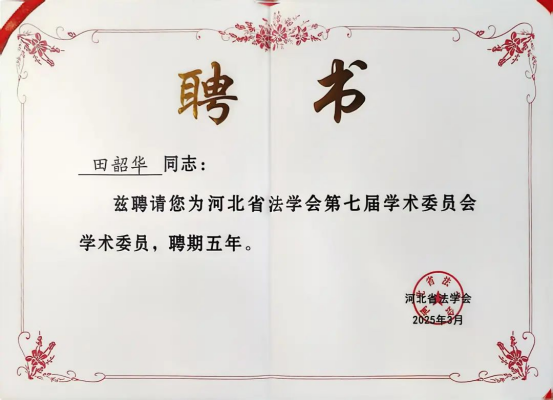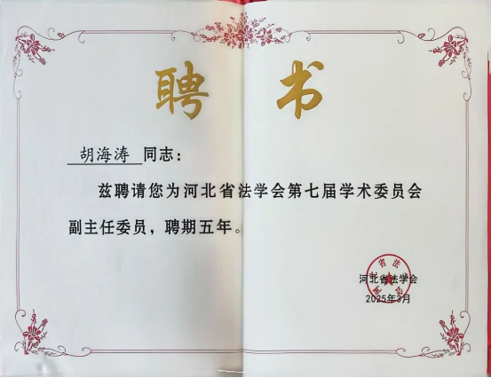 公司胡海涛经理和田韶华教授分别当选为河北省法学会第七届学术委员会副主任委员、学术委员会委员,并授予聘书。