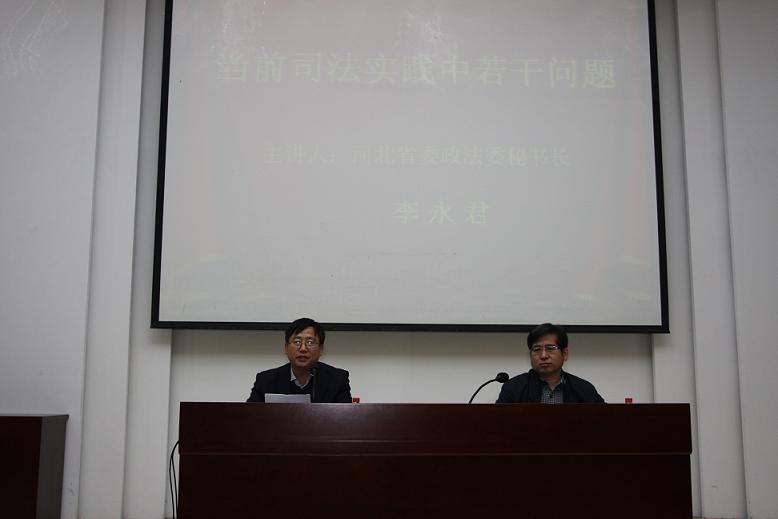 4月19日上午,永利集团3044am邀请河北省委政法委秘书长李永君在公司模拟法庭作了题为“当前司法实践中若干问题”的学术讲座。讲座由永利集团3044am经理郭广辉主持。省政法委薛兰锁主任、周保刚处长,全体院领导及部分教师、研究生、本科生等200余人参加了讲座。