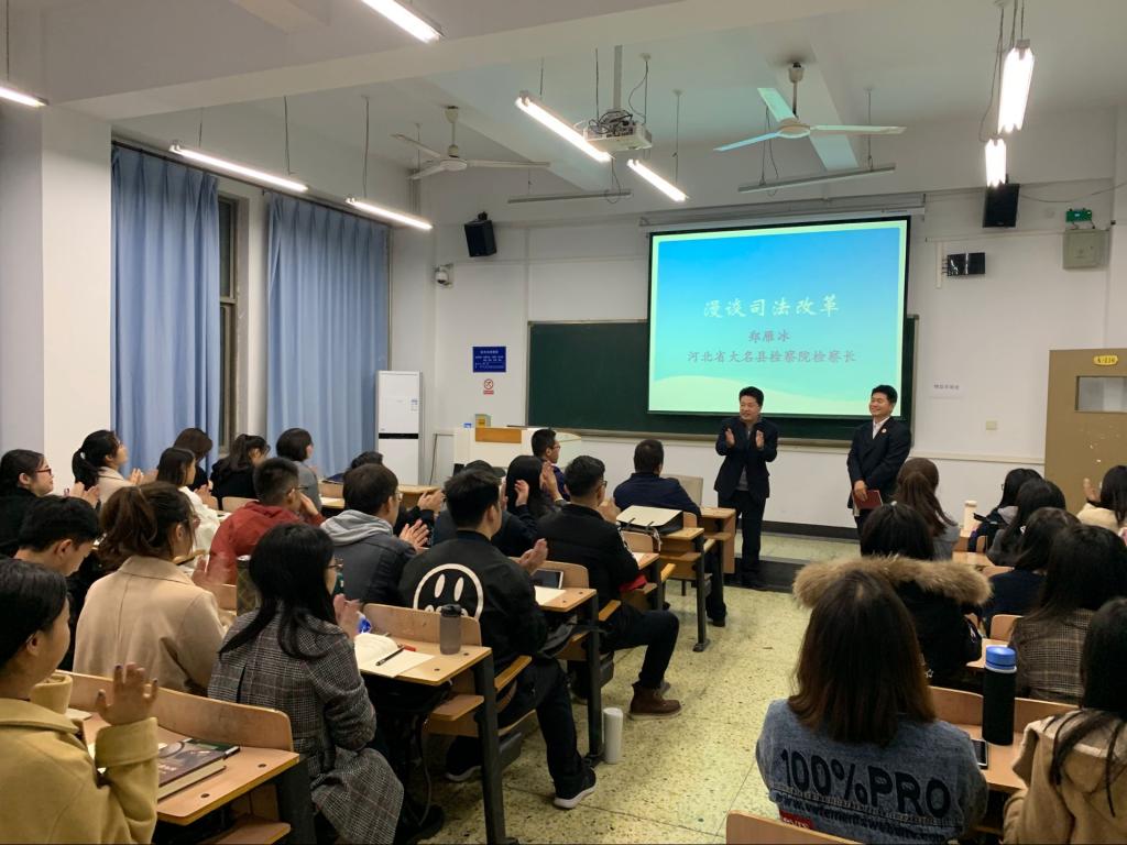 2019年11月12日,永利集团3044am邀请河北省大名县检察院检察长郑雁冰做讲座,本次讲座由永利集团3044am经理王利军教授主持,永利集团3044am研究生共50余人参加。本次讲座是“检察官进校园”系列活动之一。