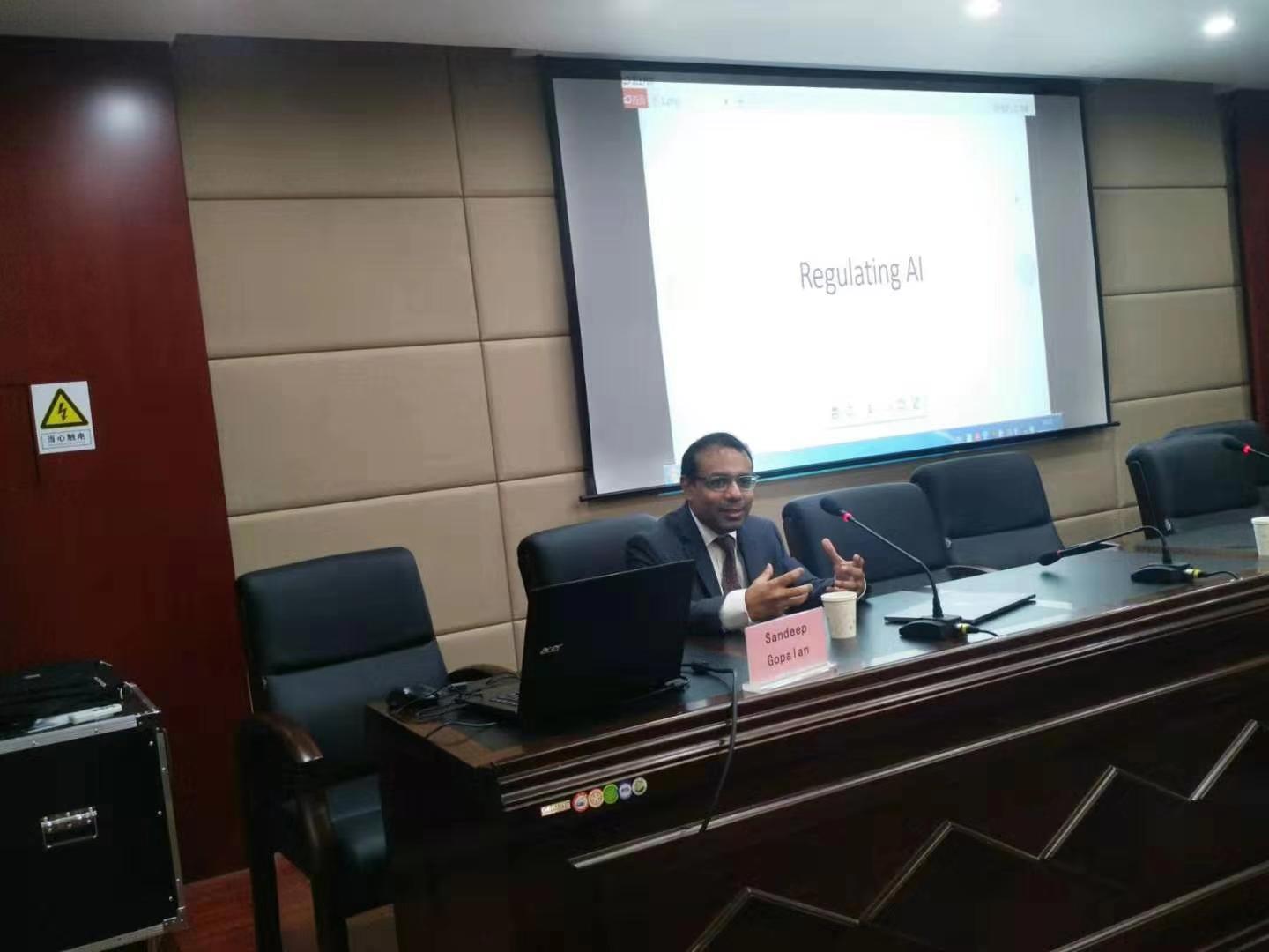 Sandeep Gopalan教授以自动驾驶汽车为例,围绕人工智能的定义、目前发展情况以及未来发展趋势作了详细的阐述。他指出,人工智能是研究、开发用于模拟、延伸和扩展人的智能的理论、方法、技术及应用系统的一门新的技术科学。我们在享受其带来的便利的同时,也应及时解决其带来的问题。他强调,人工智能的法律规则谁来定、道德与法律冲突时如何选择以及程序编写者应承担怎样的责任是人工智能在未来发展中面临的关键问题。报告最后,Sandeep Gopalan教授回答了同学们的提问,鼓励同学们深入接触人工智能,寻找人工智能与法学的结合点,使人工智能在法学实践中充分发挥作用。最后,柴伟伟老师指出,人工智能是时代发展的要求,我们应加强国际间的合作,协同解决人工智能发展所带来的问题。李大庆经理指出,Sandeep Gopalan教授的报告对公司人工智能法学实验班未来发展方向具有重要借鉴意义,对公司实现人才培养模式国际化具有重要作用。
