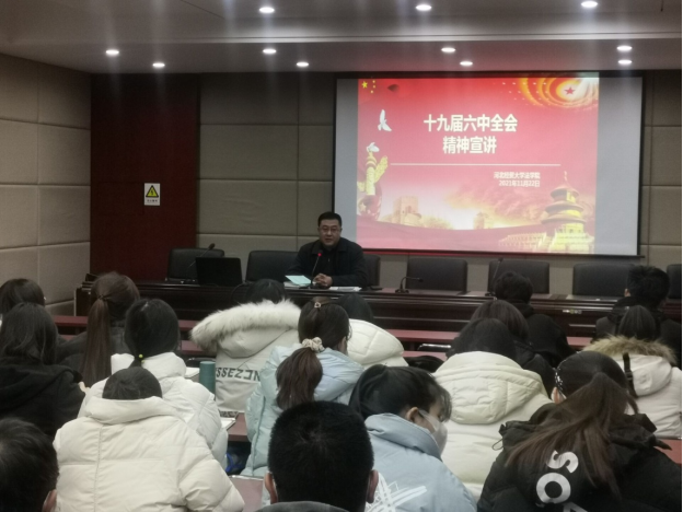 王继伟向全体同学解读了“十九届六中全会”主要内容。他指出,党的十九届六中全会是在重要历史时刻召开的具有重大历史意义的会议,全会最重要的成果是审议通过了《中共中央关于党的百年奋斗重大成就和历史经验的决议》总结了党在百年奋斗中的历史成就以及历史经验,突出中国特色社会主义新时代这个重点,总结了党的十八大以来的原创性思想、变革性实践、突破性进展和标志性成果。王继伟向同学们阐述了新时代强化“四个意识”,加强“四个自信”,做到“两个维护”的重大意义,他号召全体同学要紧跟党的步伐,努力学习、勇毅前行,为实现第二个百年奋斗目标,建设社会主义现代化强国添砖加瓦。