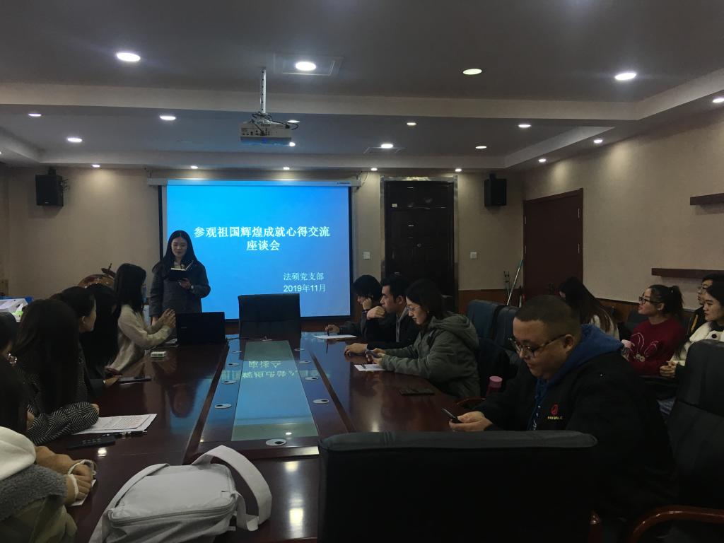 为认真贯彻落实“不忘初心 牢记使命”主题教育精神,2019年11月14日,永利集团3044am法硕党支部在支部书记赵娜老师的带领下开展了参观祖国辉煌成就心得交流座谈会,会议地点在第二办公楼会议室,法硕党支部全体成员参加。
