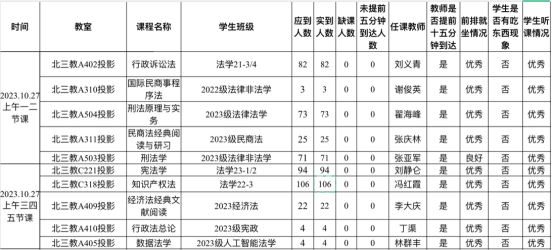 教学运行总体情况良好。检查组安排16名工作人员分别到各个教室,对10月27日上午的教学情况进行了全面检查,共检查10个教学班。教师们提前十五分钟到达教室并打开课件,整体课堂氛围活跃。同学们按时提前到达教室,认真听讲并思考课堂知识,与老师积极互动,及时记录课堂笔记,课堂纪律优秀,无在教室吃东西以及迟到现象。