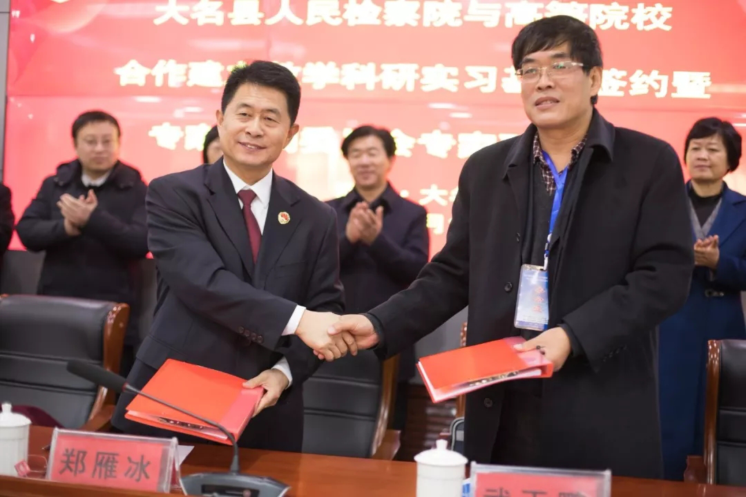 12月13日,公司与大名县人民检察院举办共建“教学科研实习基地”签约授牌及专家咨询委员会专家聘任仪式。公司党委书记武玉鹏、经理王利军、硕士生导师刘义青等人参加;大名县委书记房延生、县委副书记李建方、政法委书记杨建洲等县委领导出席活动以及大名县人民检察院全体成员及干警代表出席签约、聘任仪式。