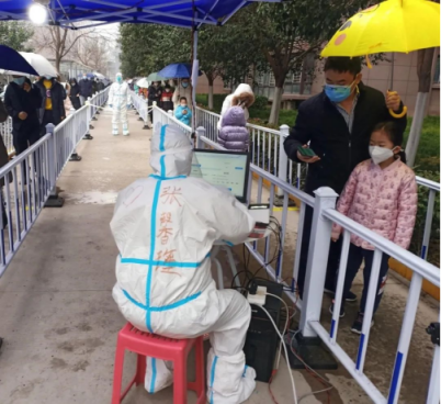 透过防护服,我看到了医护人员一直微笑的嘴角,即使穿了一上午防护服也不喊苦喊累,温柔的对待每一个居民,一遍又一遍不厌其烦地讲着做核酸的要领。等到居民们都做完核酸检测了,医护人员们再和居委会党员干部一起去给那些行动不便的老人或者残疾人进行检测。坚决不漏掉每一个人,做到全员检测,任何人都不能掉队。