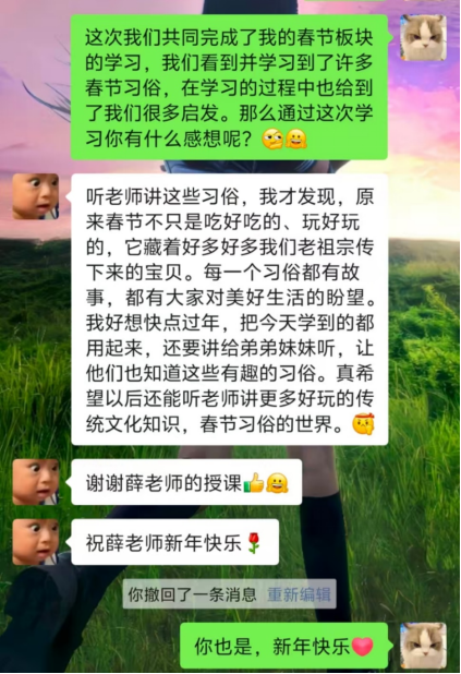 在春节团圆氛围中借助云支教契机,不仅让志愿者在实践中锻炼教学能力、沟通能力和责任感的机会,在奉献爱心的同时,收获宝贵的人生经验,实现自我价值和个人成长。同时还向支教员工分享各地春节传统习俗,促进不同地域文化交流,让他们感受春节文化的多元性,增强对传统文化的认同感和自豪感。此次云支教活动,展现了志愿者和员工之间的友爱与热情,为之后云支教活动的开展打下了坚实的基础。