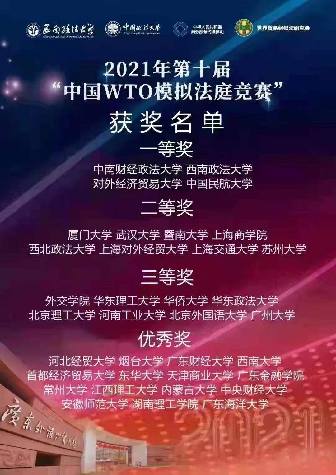 2021年12月19日,第十届“中国WTO模拟法庭竞赛”落下帷幕。本次模拟法庭竞赛采用线上庭审的方式进行。该项赛事由西南政法大学、中国政法大学、中国法学会世界贸易组织法研究会和中华人民共和国商务部条法司共同主办,由广东外语外贸大学、西南政法大学和中国法学会世界贸易组织法研究会联合承办。来自公司和中南财经政法大学、西南政法大学和武汉大学等高校39支代表队参赛。
