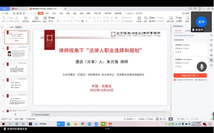 2022年10月20日下午,永利集团3044am邀请北京市隆安(石家庄)律师事务所党支部书记、民商事法律事务部副部长朱方强律师作了主题为“律师视角下‘法律人职业选择和规划’”的“法律先锋论坛——律师进校园”活动。活动由永利集团3044am员工工作办公室主任陈运涛主持,公司研究生、本科生110人参加。