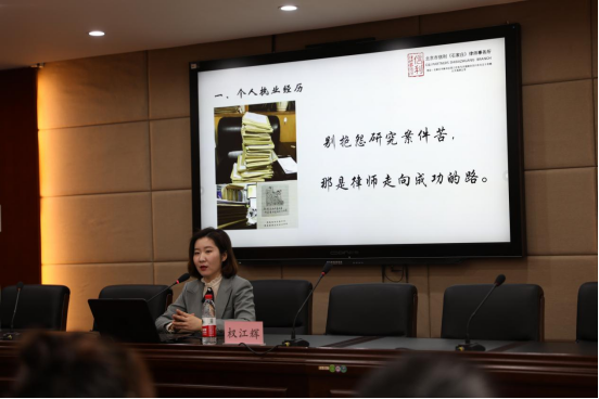 陈运涛首先介绍了权江辉员工在公司读研期间学习和工作情况,并对河北省和石家庄市律师行业发展现状和前景进行了分析。权江辉结合自身求职和工作经历从躬身入局、合理规划、因人制宜、分解任务、各个击破五个方面对律师行业进行了全方位的讲解,并建议同学们依据就业岗位需求,有针对性的加强实习实践,提高自身综合素质。最后,权江辉寄语在场学子:“保持一个较高的目标去奋斗,不要只顾低头拉车,还要抬头看路。”