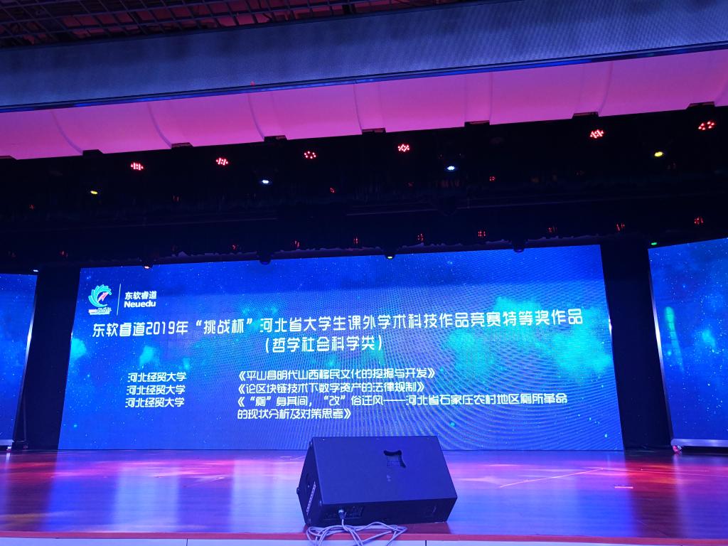 5月24日-26日,2019年“挑战杯”河北省老员工课外学术科技作品竞赛终审决赛在东北大学秦皇岛分校举行。公司2017级民商法学孙岩等同学负责的项目《论区块链技术下数字资产的法律规制》获省级特等奖(哲学社会科学类);柴振国教授获省级“优秀指导教师”称号。
