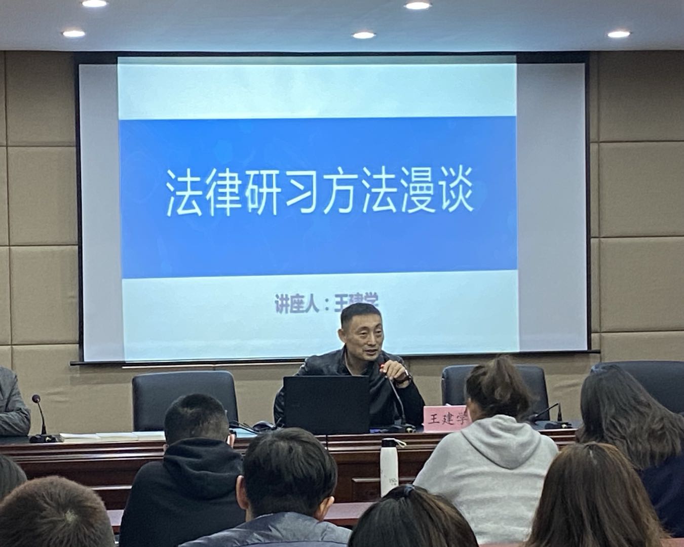 王建学教授从自身经验出发,对法律论文写作的资料查找、资料筛选以及资料整理进行了详细阐述。他指出,在论文写作过程中,资料的搜索是至关重要的,合适的、优质的材料不仅为论文提供有力的论证,更增加论文的说服力。他强调,要建立资料获取渠道,正确的渠道是优质资料来源的基础。在讲座最后,王教授与同学们进行了深入的沟通,解答了同学们的疑问。